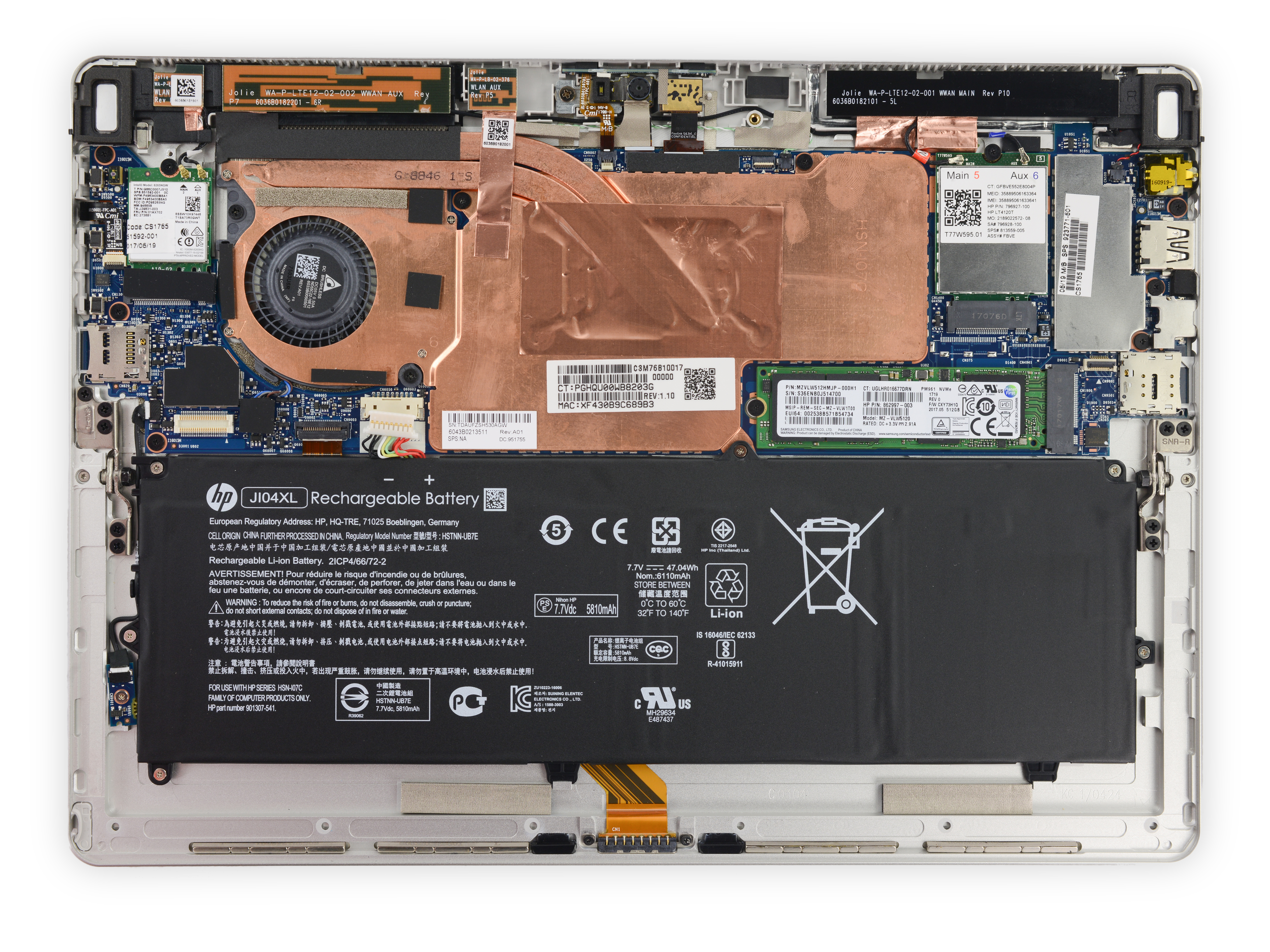 Despite that rough ending, this really is a highly-serviceable tablet. Anyone with the right (standard) screwdriver and a suction cup should be able to easily perform battery or screen replacements. The only moving part—the hinge—can be swapped out without even opening the tablet. Despite these positives, we have to account for the addition of copper tape and shifting ports—high stress parts—from a daughterboard to the main system board. These changes make repairs more difficult and more expensive, so the 2017 revision of the HP Elite x2 1012 slides down from a perfect 10/10 to a 9/10 on our repairability scale. Even with this one-point demerit, however, the G2 still stacks up highly for repairability compared to other tablets on the market and therefore earns our stamp of approval.