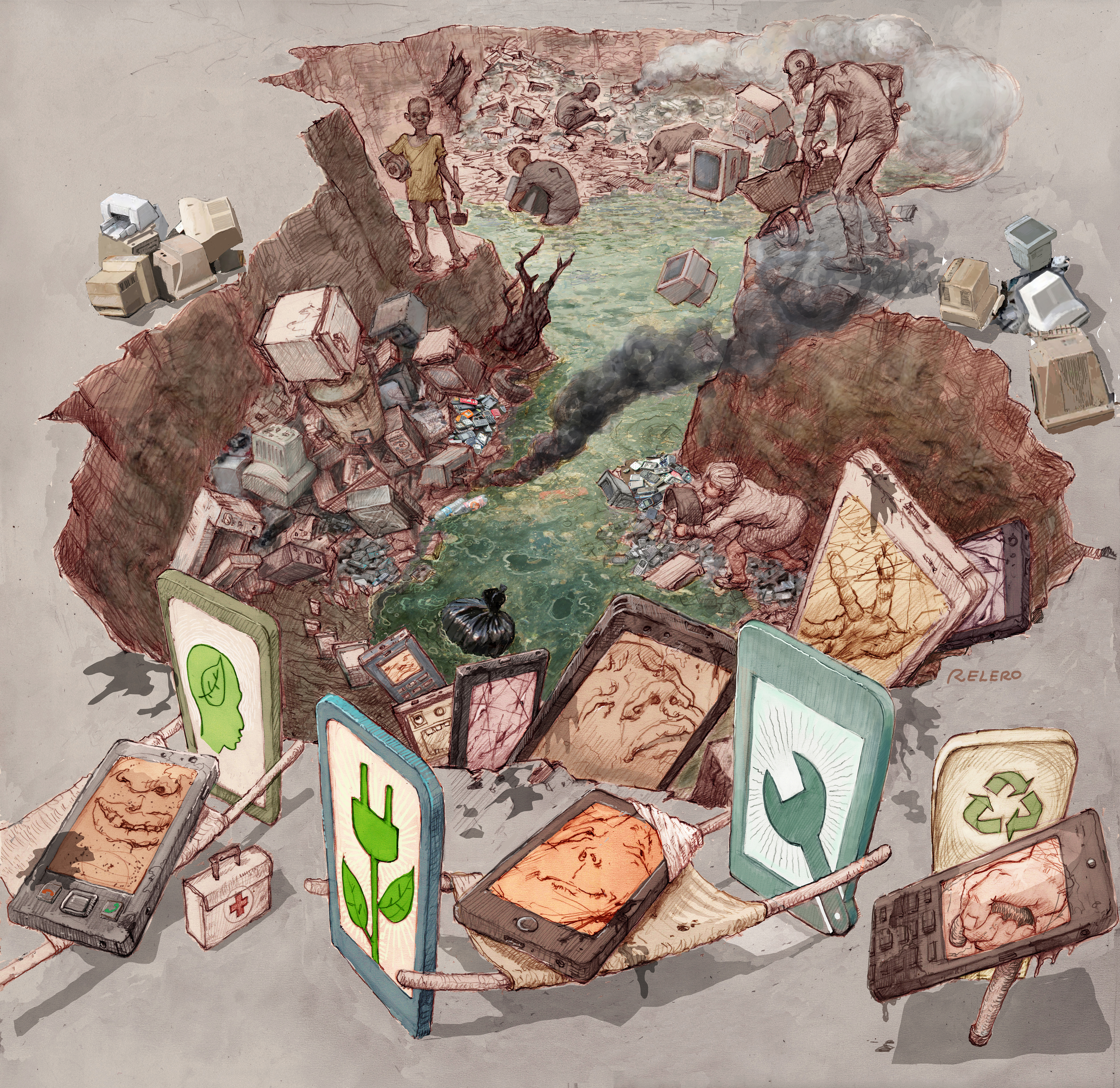 As far as messages go—this one ain’t subtle. The 3D pavement art opens a chasm of e-waste under the feet of attendees. Figures deep inside scavenge amongst the world’s high-tech refuse—as more and more old and broken devices tumble in.